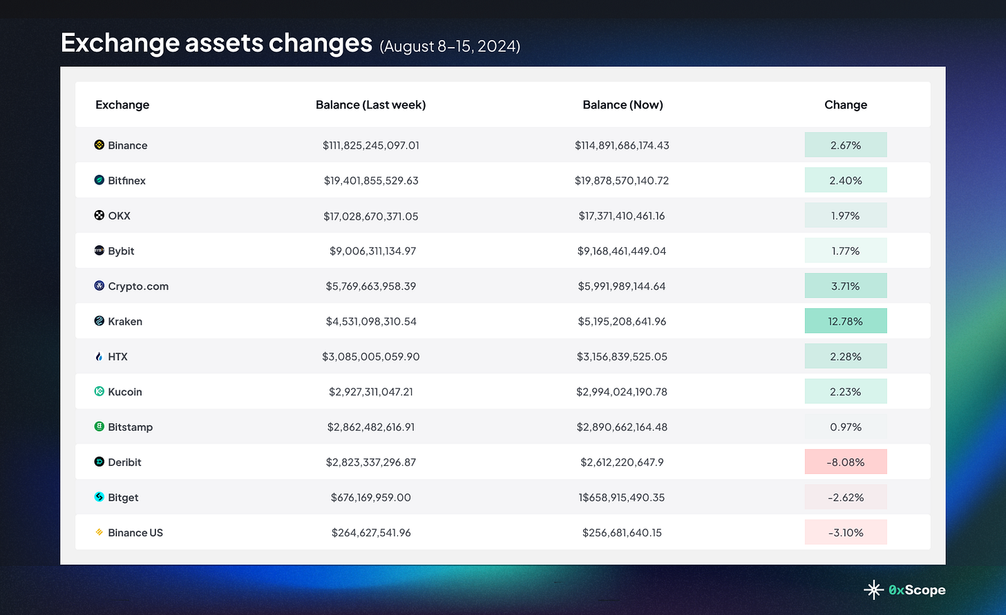 This week, exchanges saw less market volatility compared to the previous week’s flash crash that sparked a $17.2B asset decline. Major exchanges cumulatively regained $4.9B in net asset values, with Kraken becoming the biggest winner with 12.78% growth. Most of the other major exchanges saw growth in the low single digits, while smaller exchanges mostly declined, with Deribit having a bad week after an 8.08% fall.