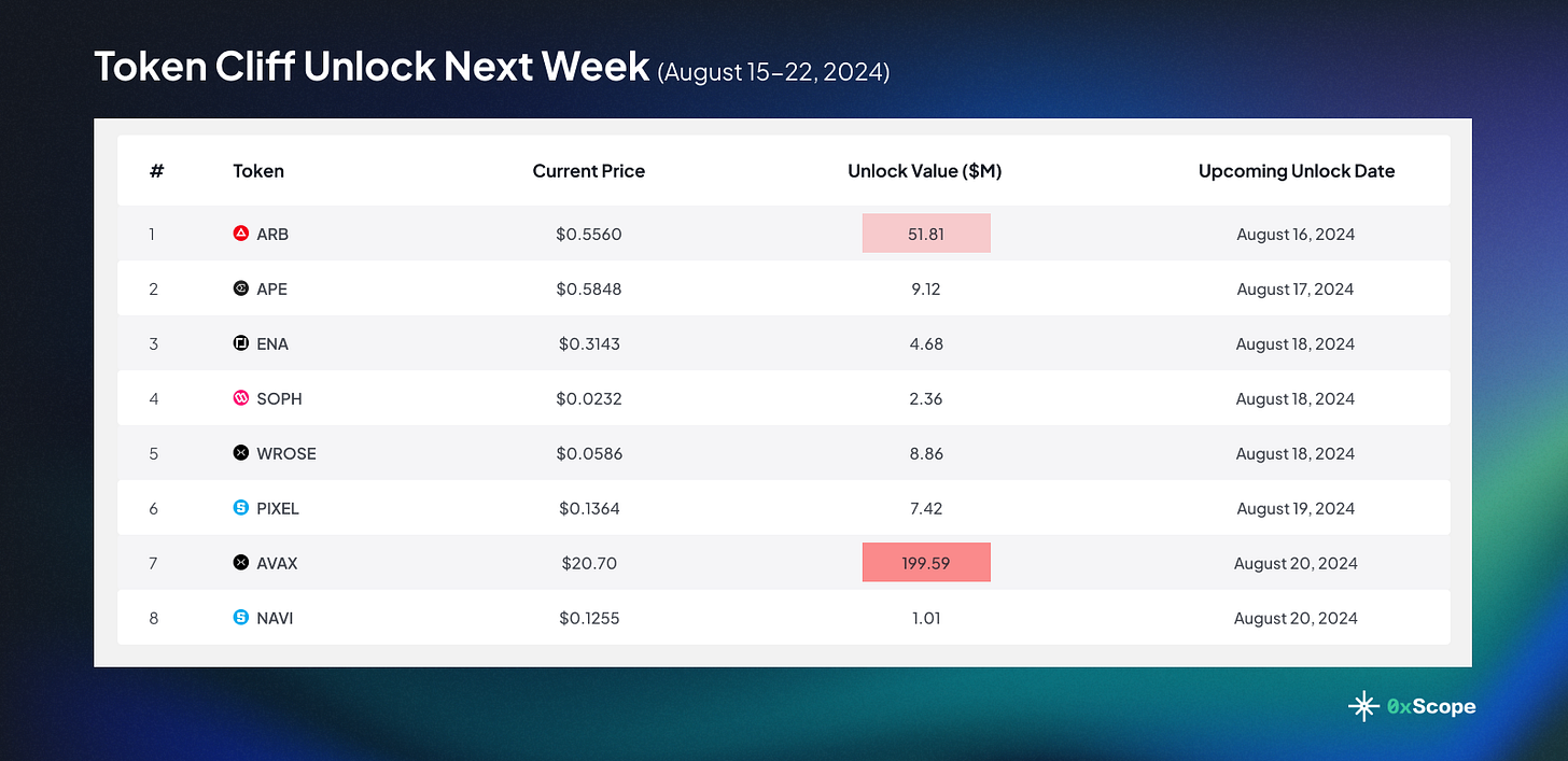 This week, watch out for the major unlock of $51.81M worth of $ARB tokens on August 16, followed by an even bigger $199.59M unlock for $AVAX on August 20.